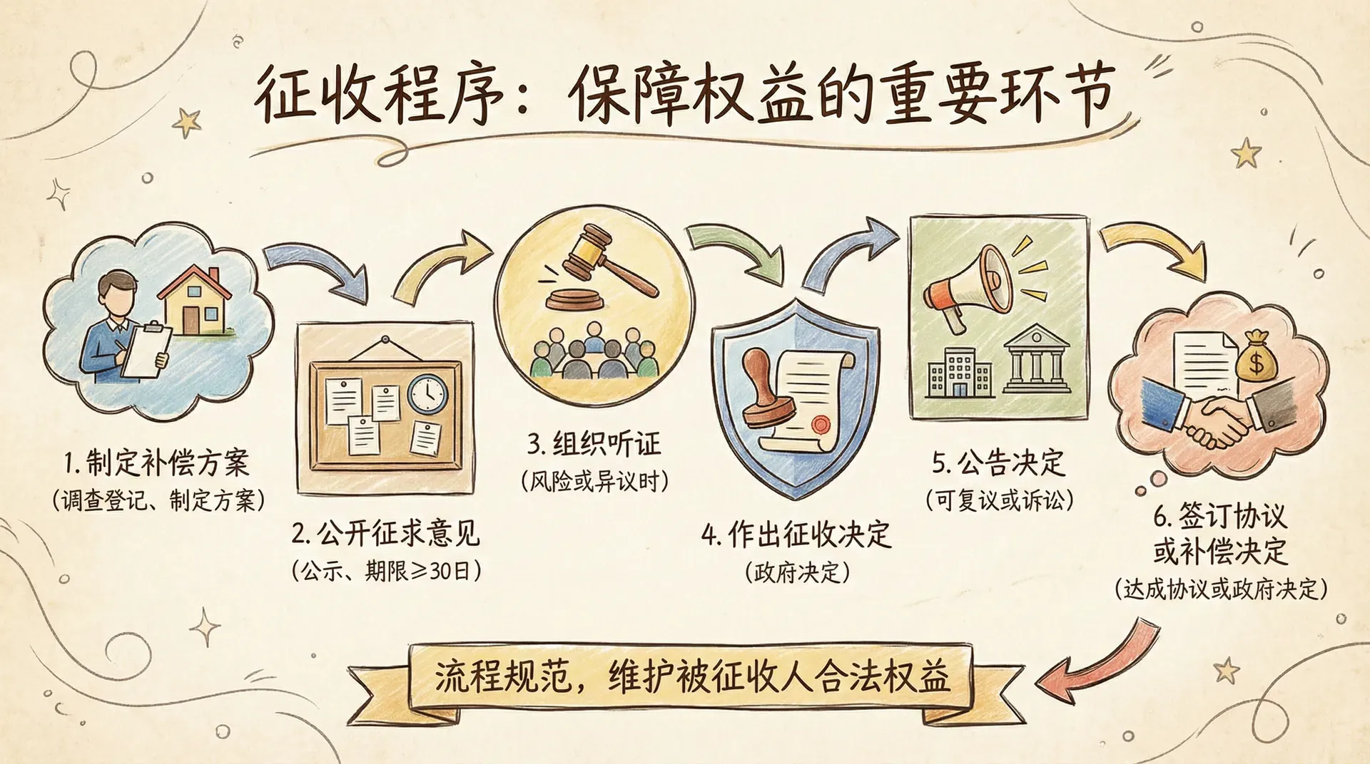 征收程序是保障被征收人权益的重要环节。根据法律规定,征收一般要经过以下程序: