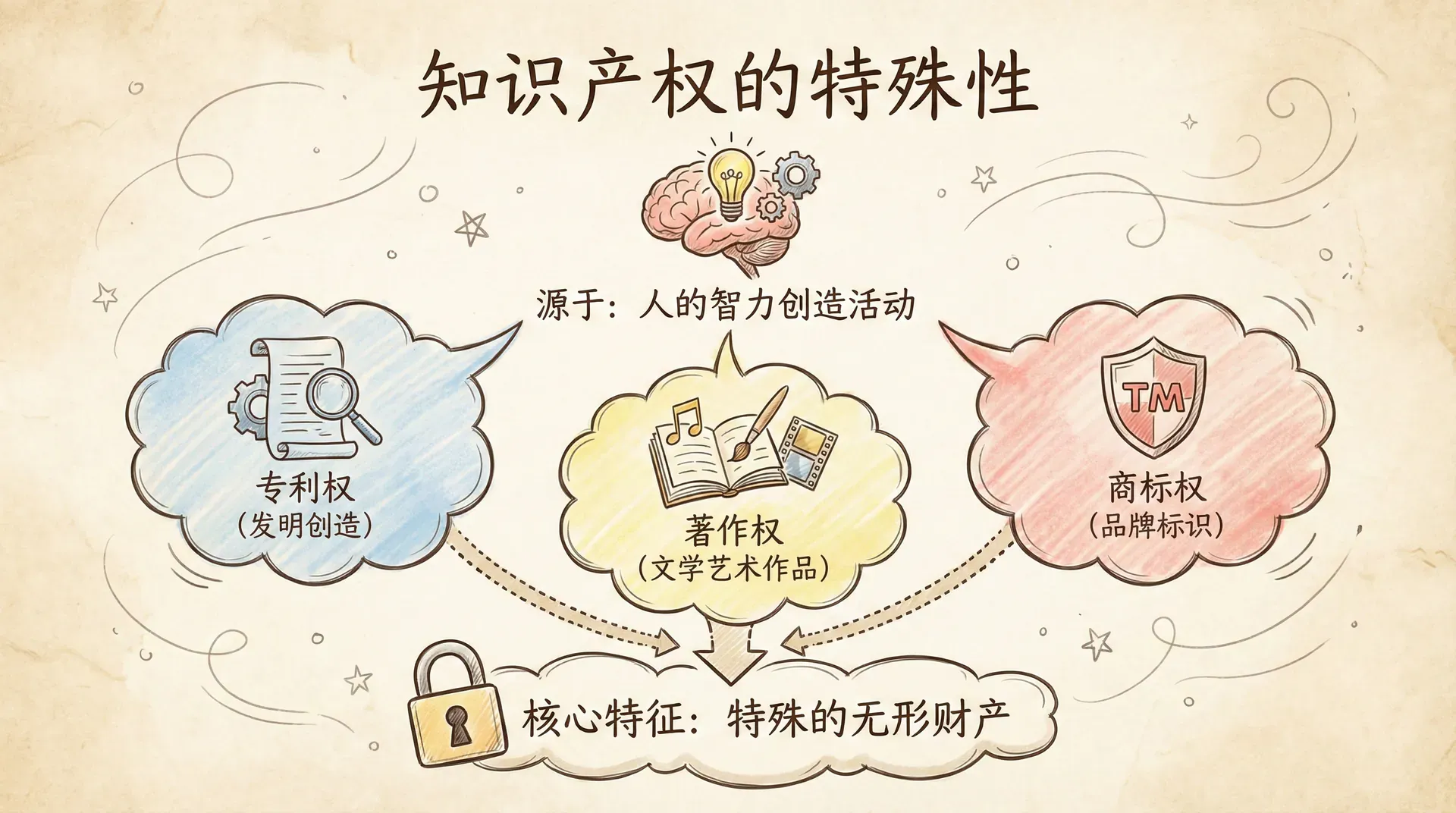 知识产权的存在说明了一个重要道理:财产不是自然存在的,而是法律创造的。没有专利法,发明仍然会存在,但发明人不会拥有排他性的权利。没有著作权法,小说和音乐仍然会被创作出来,但创作者无法阻止他人的复制和传播。正是法律的规定,才把这些无形的智力成果变成了可以被拥有、被转让、被保护的“财产”。