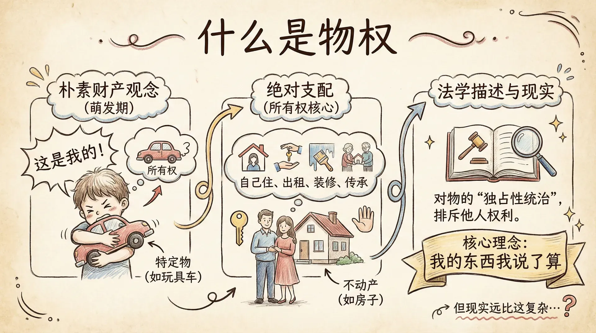 每个人从小就有一种朴素的财产观念。三岁的孩子紧紧抱着自己的玩具汽车,嘴里喊着“这是我的!”——这可能是人类最早萌发的法律意识之一。这声“我的”里面,包含着一个核心概念:所有权。孩子觉得这辆玩具车属于他,可以决定怎么玩、让不让别人碰、要不要送给表弟。同样的道理,孩子的父母觉得城里那套房子属于他们,可以自己住、可以出租、可以装修成任何风格、也可以将来留给孩子。