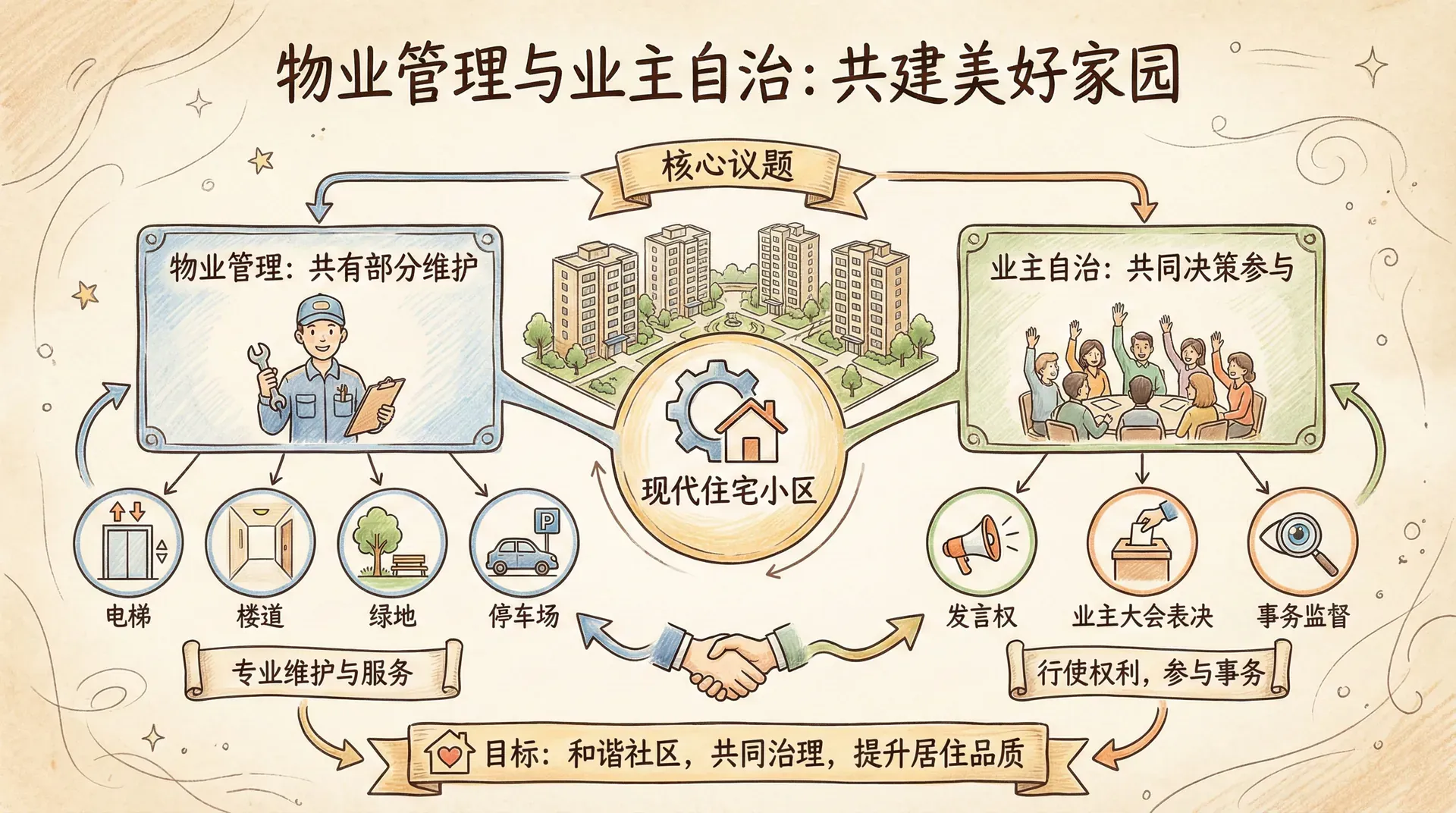 在现代城市,大多数人居住在住宅小区中。小区里有共用的电梯、楼道、绿地、停车场——这些“共有部分”如何管理?每个业主对小区事务有什么发言权?这涉及物业管理和业主自治的问题。