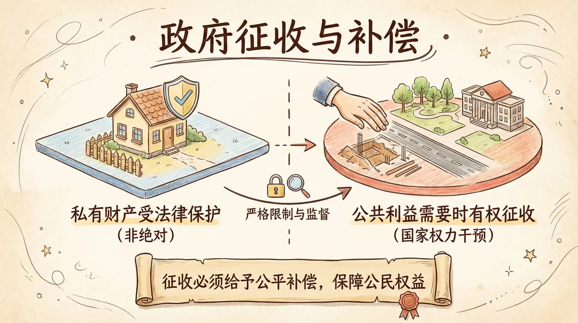 私有财产受法律保护,但这种保护不是绝对的。当公共利益需要时,政府有权征收公民的房屋和土地。征收是国家权力对私有财产的最严重干预,因此必须受到严格的限制和监督。