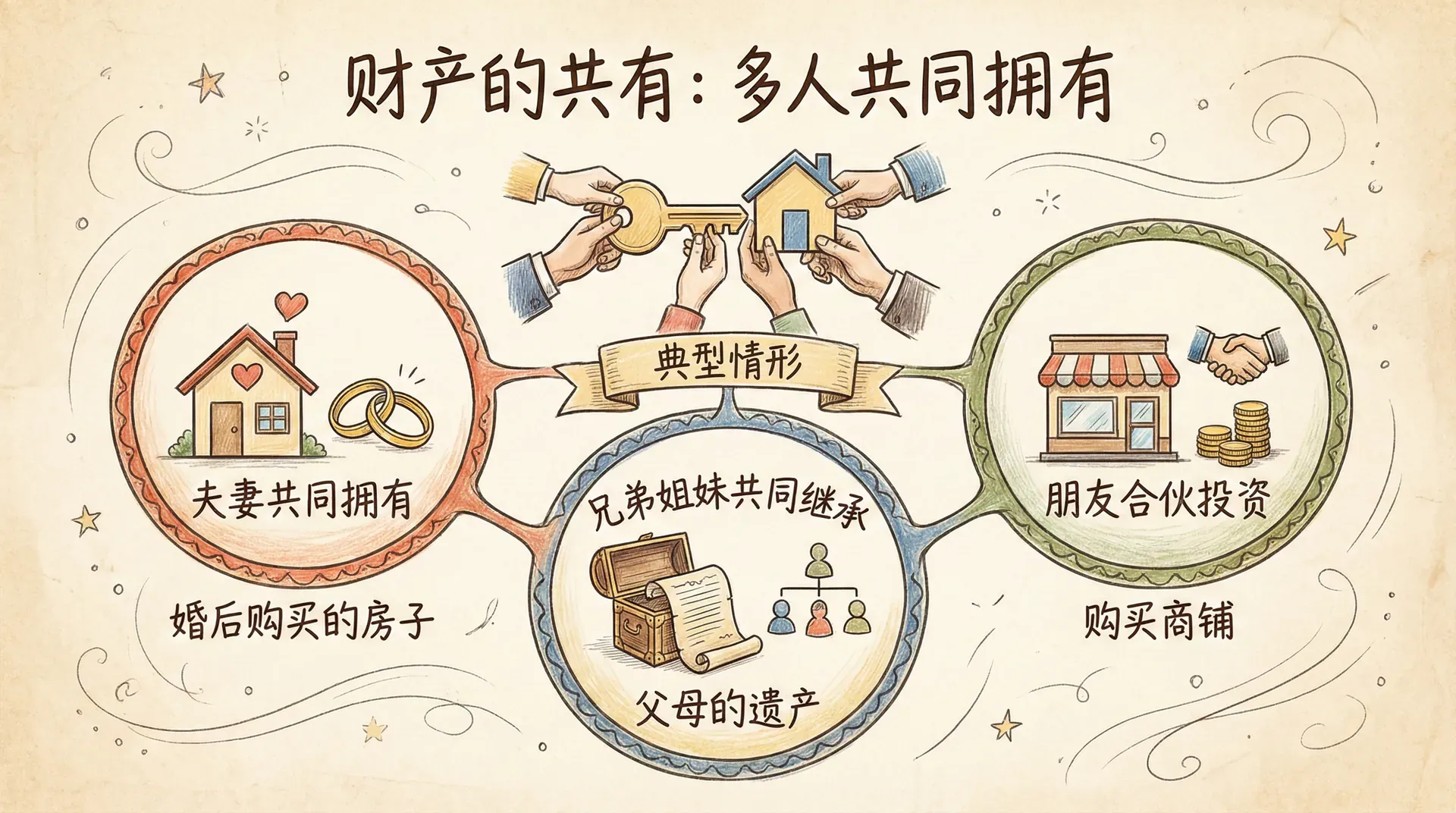 财产常常由多人共同拥有:夫妻共同拥有婚后购买的房子,兄弟姐妹共同继承父母的遗产,几个朋友合伙投资购买商铺——这些都是“共有”的典型情形。