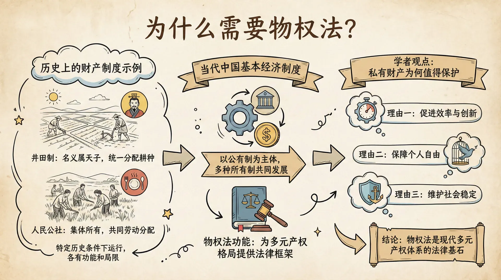 当代中国实行的是以公有制为主体、多种所有制经济共同发展的基本经济制度。物权法的功能,正是为这种多元的产权格局提供法律框架。私有财产为什么值得保护?学者们从不同角度给出了三类理由。