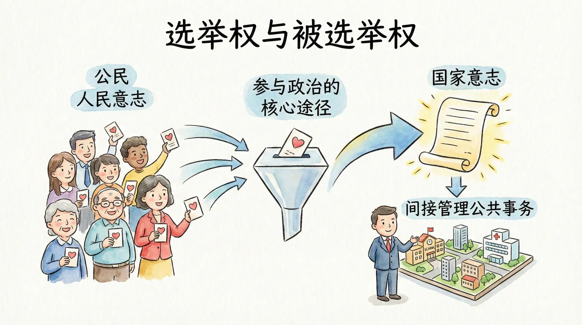 选举权是公民参与国家政治生活的核心途径。通过选举,人民将自己的意志转化为国家意志,实现对公共事务的间接管理。