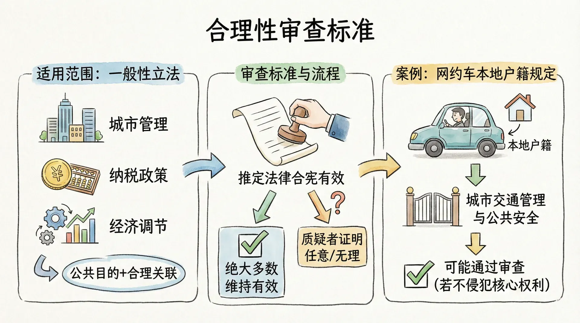 在合理性审查中,法律被推定为合宪有效,质疑者需要证明法律是“任意的”或“毫无道理的”,因此绝大多数经济社会立法都能获得维持。以某地政府规定网约车司机须具有本地户籍为例,这一规定虽限制了外地户籍人员的就业机会,但只要政府能说明这与城市交通管理、公共安全等合法目的存在合理联系,便可能通过审查。当然,若该规定被认为侵犯迁徙自由或就业平等权,则可能需要适用更严格的审查标准。
