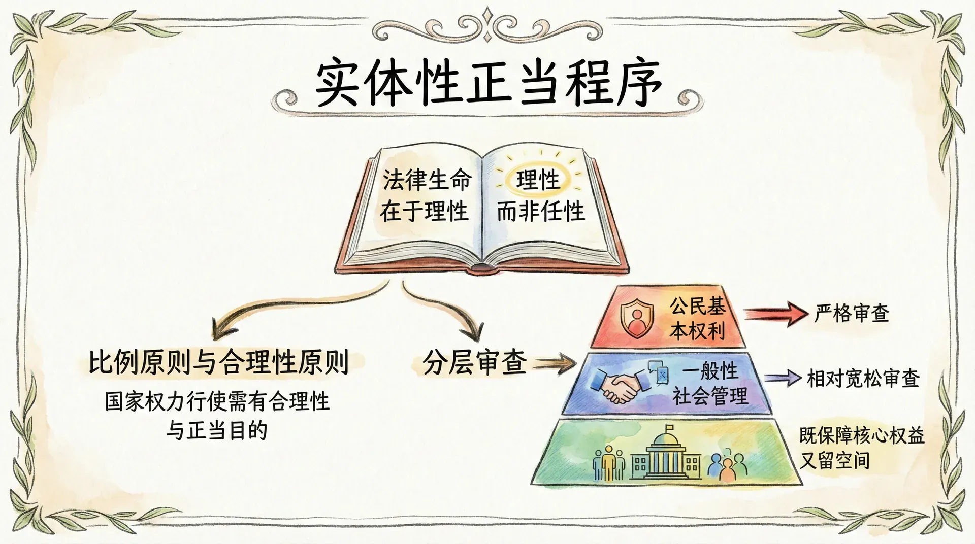实体性正当程序是法治国家的基石,它要求每一项限制公民权利的法律和政府行为,都必须经得起合理性与正当性的检验。在这一框架下,基本权利获得最严格的保护,一般性权益也免于任意侵害。