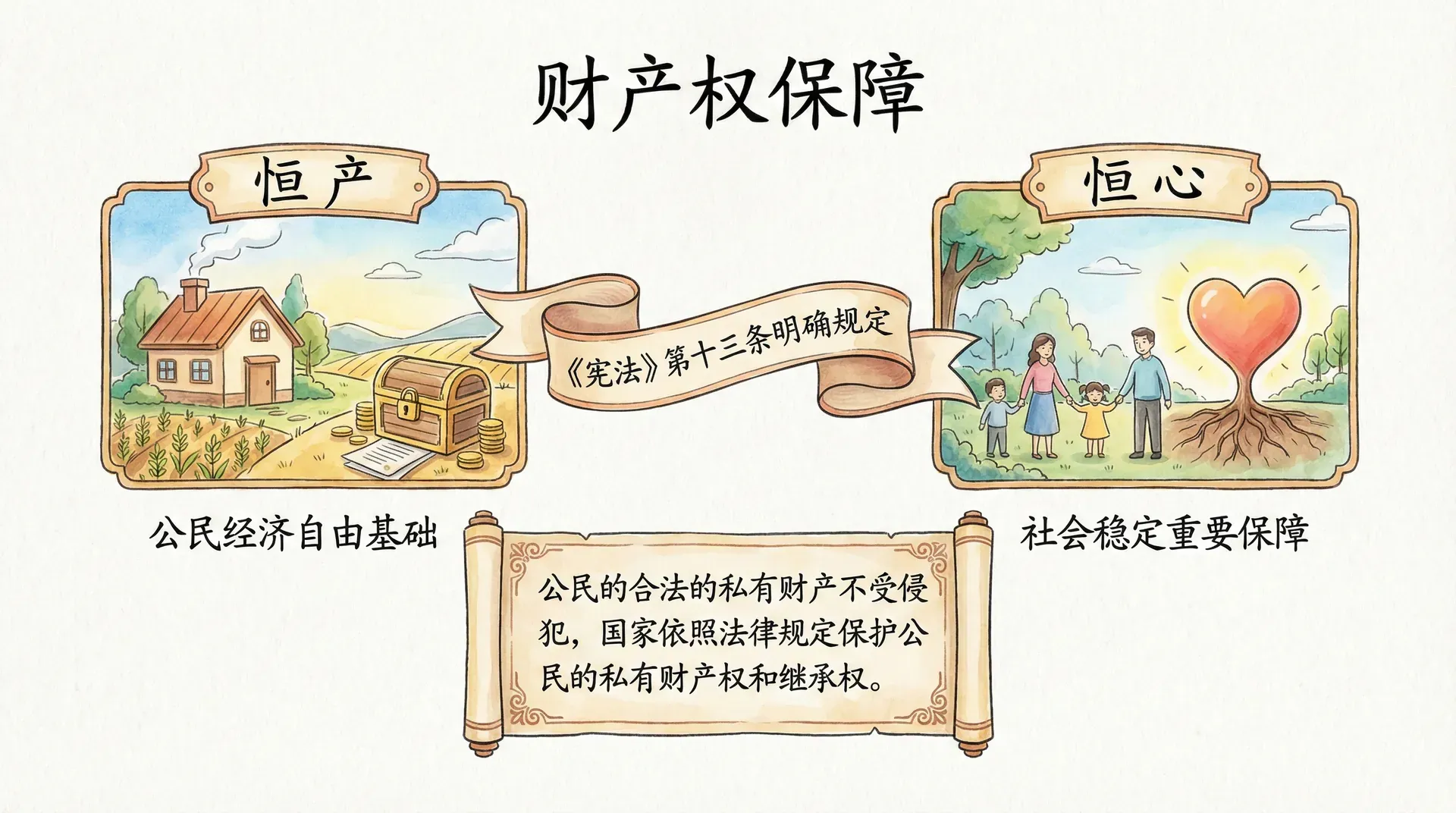 “有恒产者有恒心”,财产权是公民经济自由的基础,也是社会稳定的重要保障。《宪法》第十三条明确规定:“公民的合法的私有财产不受侵犯,国家依照法律规定保护公民的私有财产权和继承权。”