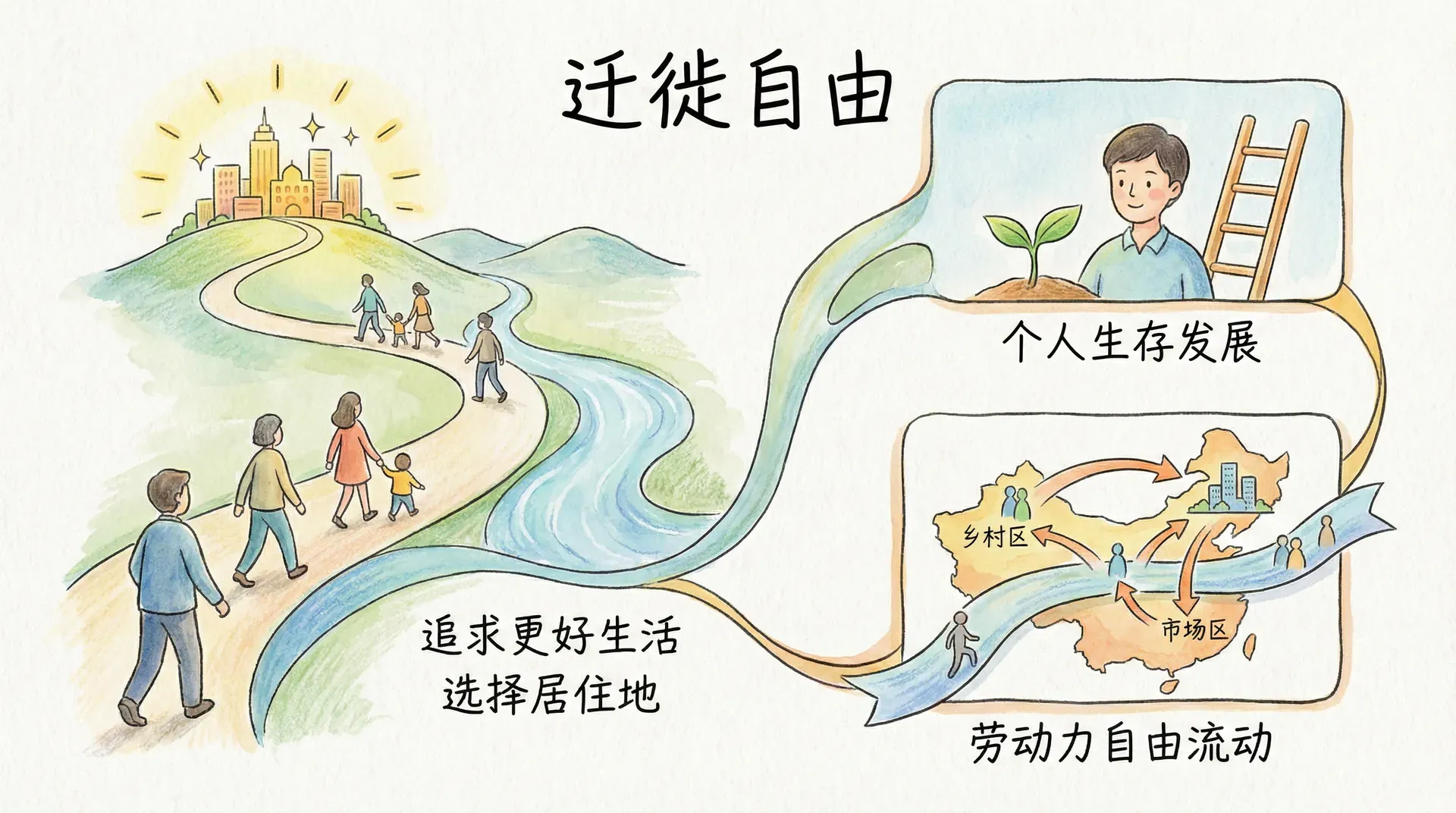 人往高处走,水往低处流。迁徙自由是公民选择居住地、追求更好生活的基本权利,不仅关乎个人的生存发展,也是市场经济条件下劳动力自由流动的制度保障。