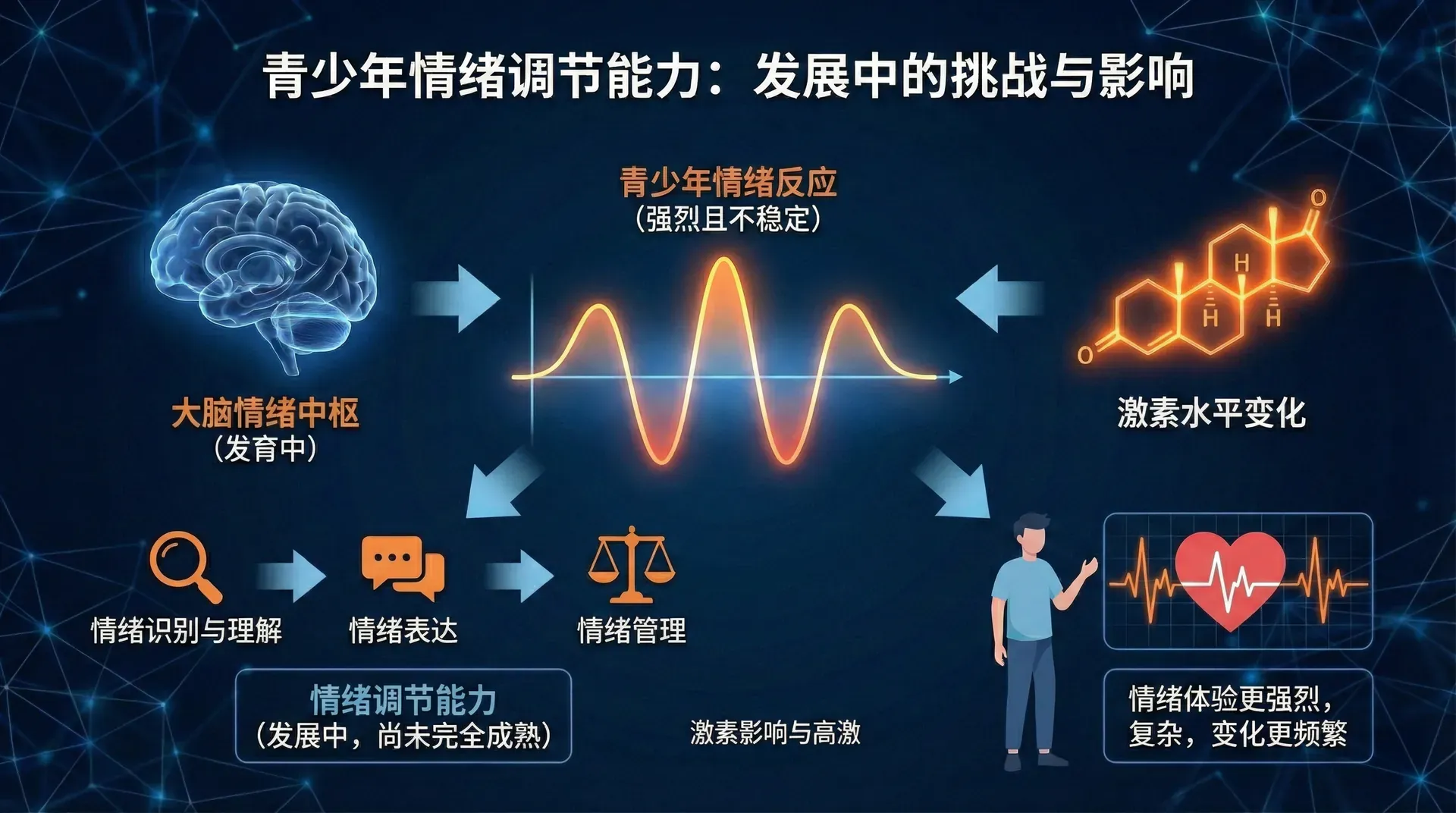 情绪调节是指个体监控、评价和调整情绪反应的能力,包括情绪的识别、表达、理解和管理。良好的情绪调节能力是心理健康和社会适应的基础,也是预防行为问题的保护因素。青少年时期,情绪调节能力正处于发展的关键阶段,但尚未完全成熟,这使得青少年的情绪生活既丰富又不稳定,对其行为有着深刻影响。