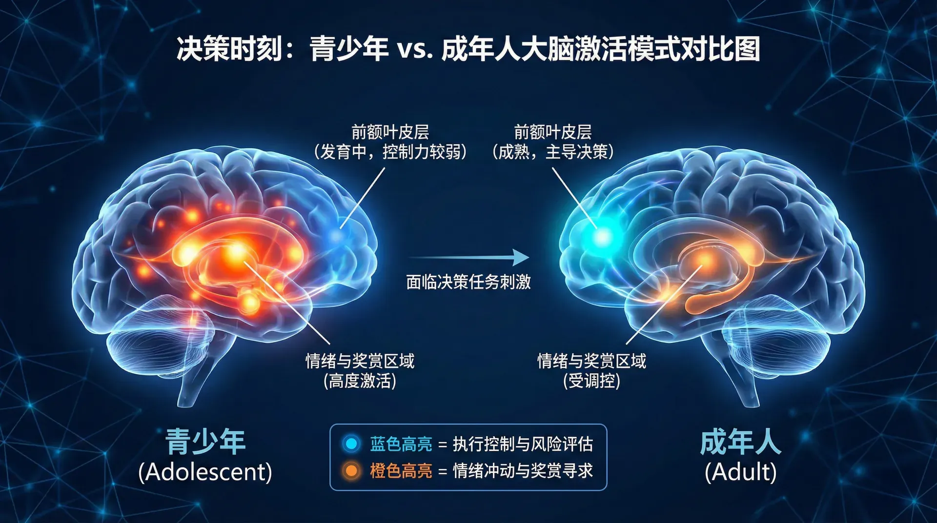 青少年的认知能力具有情境依赖性。在低压力、无干扰的实验室环境中测试,青少年的认知表现可能接近成年人;但在真实的、复杂的、充满压力和诱惑的生活情境中,其认知能力的实际表现可能大打折扣。
