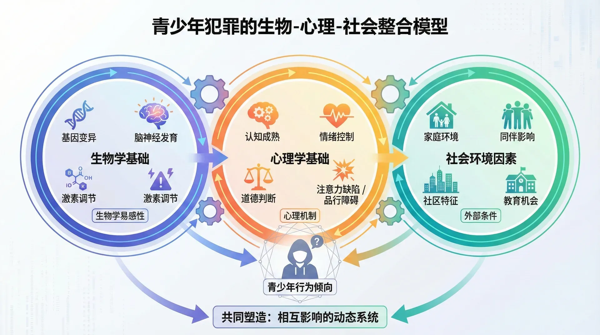 生物-心理-社会模型为整合性的理解提供了框架。青少年犯罪行为的发生,是生物学易感性、心理发展特点和社会环境因素共同作用的结果。生物学因素如基因变异、大脑发育不成熟、激素水平异常,为违法行为提供了生物学基础,但并不直接决定行为。这些生物学因素需要通过心理机制发挥作用,影响冲动控制能力、情绪调节能力、风险感知能力等。而心理机制是否最终导致违法行为,又取决于社会环境因素,如家庭环境、同伴影响、社区特征、教育机会等。
