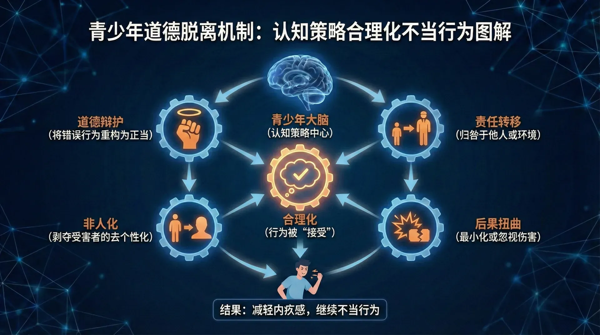 青少年在道德脱离机制的运用上可能比成年人更频繁。当青少年群体一起从事违法行为时,责任扩散机制尤为明显,每个人都觉得自己只是参与者之一,责任不全在自己。当违法行为针对非本群体成员时,非人化和归咎被害人机制可能被激活。理解这些机制,有助于在教育干预中针对性地挑战青少年的扭曲认知。