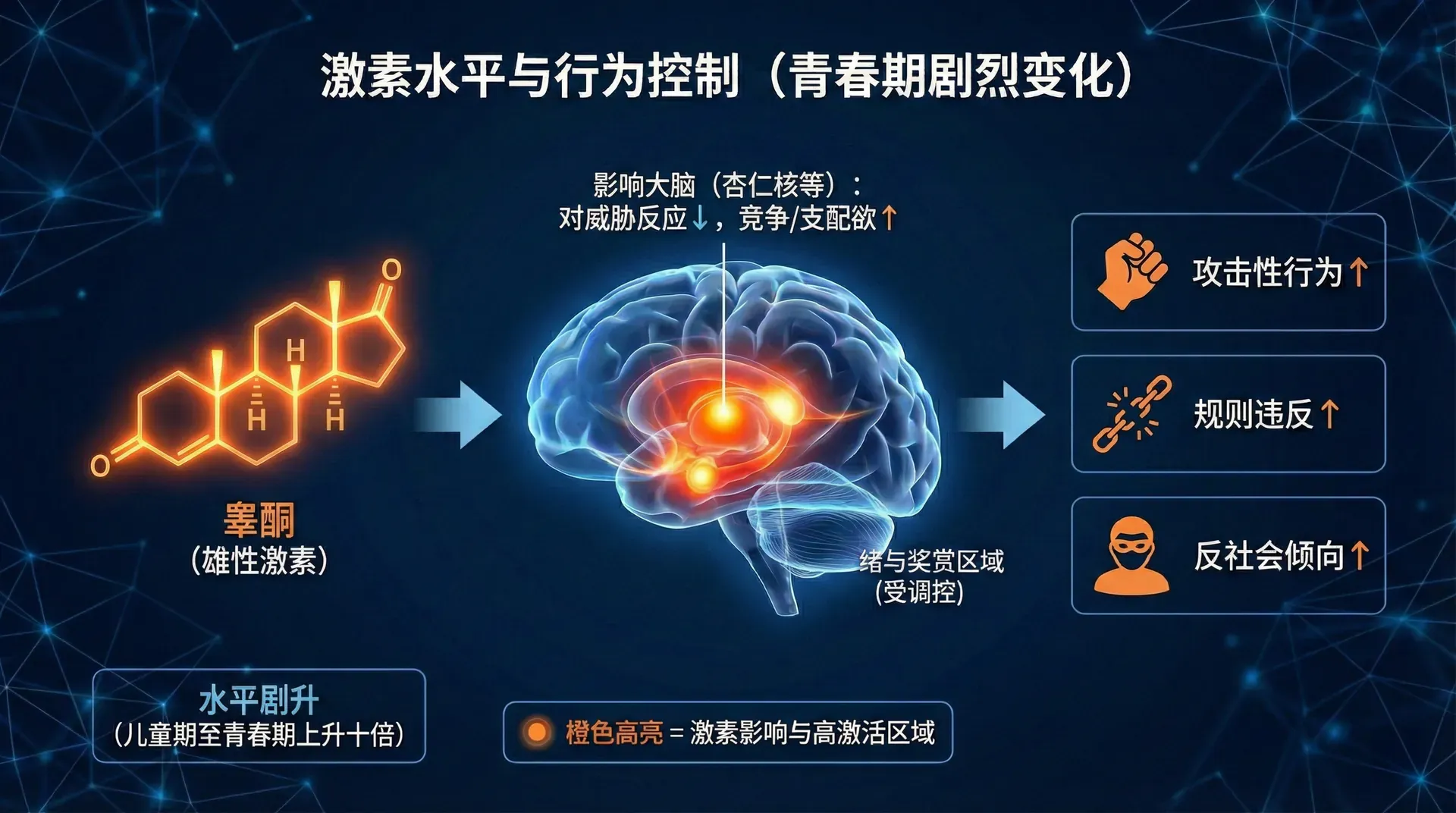 睾酮是研究最多的与攻击行为相关的激素。这种雄性激素在男性青春期大量分泌,其水平从儿童期到青春期可以上升十倍以上。睾酮影响大脑中杏仁核等与情绪和攻击性相关的区域,降低个体对威胁性刺激的恐惧反应,增强竞争性和支配欲。青少年男性的睾酮水平与其攻击性行为、规则违反和反社会倾向之间存在正相关。
