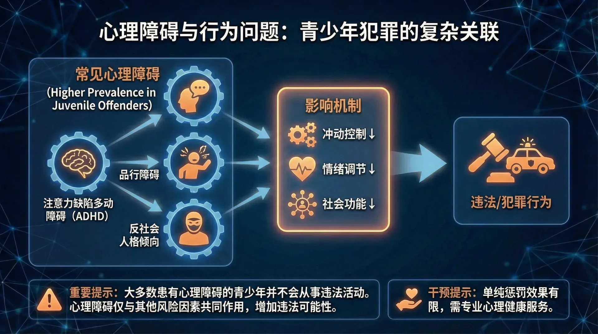心理障碍并不必然导致犯罪,大多数患有心理障碍的青少年并不会从事违法活动。心理障碍是通过影响青少年的冲动控制、情绪调节、社会功能等方面,在与其他风险因素的共同作用下,增加违法行为的可能性。同时,心理障碍的存在也提示我们,对某些青少年犯罪者,单纯的惩罚可能效果有限,他们可能需要专业的心理健康服务。