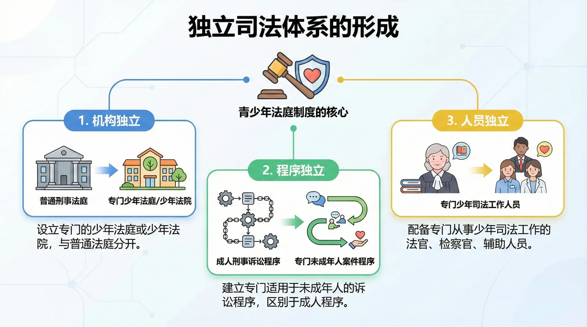 独立司法体系的形成是青少年法庭制度确立的核心内容。所谓独立,主要体现在三个方面:一是机构独立,即设立专门的少年法庭或少年法院,与普通刑事法庭分开;二是程序独立,即建立专门适用于未成年人案件的诉讼程序,区别于成人刑事诉讼程序;三是人员独立,即配备专门从事少年司法工作的法官、检察官和其他司法辅助人员。