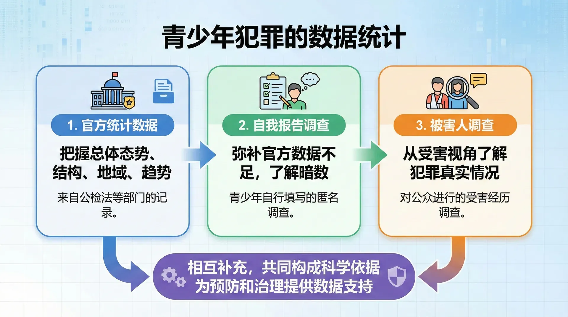 了解青少年犯罪的现状和趋势,离不开科学的统计数据。通过对犯罪数据的分析,可以把握青少年犯罪的总体态势、结构特点、地域分布、发展趋势等重要信息,从而为预防和治理青少年犯罪提供科学依据。青少年犯罪统计主要有三种来源:官方统计数据、自我报告调查和被害人调查。这三种方法各有优势和局限,相互补充,共同构成了青少年犯罪研究的数据基础。
