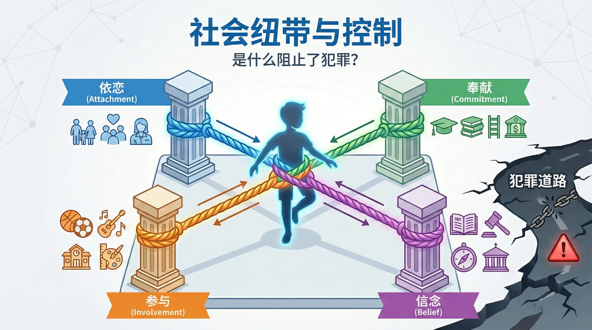 社会纽带理论的启示是,预防青少年犯罪需要全方位地强化他们与社会的纽带。家庭要建立和维护良好的亲子关系,让孩子感受到爱和关怀;学校要帮助学生建立对未来的信心和规划,让他们对传统成功途径保持投入;社会要为青少年提供丰富的正当活动机会,充实他们的生活;文化要培育对法律和道德的尊重,强化价值信念。当这四个方面的纽带都很强韧时,青少年就会与社会紧密相连,犯罪的可能性自然降低。