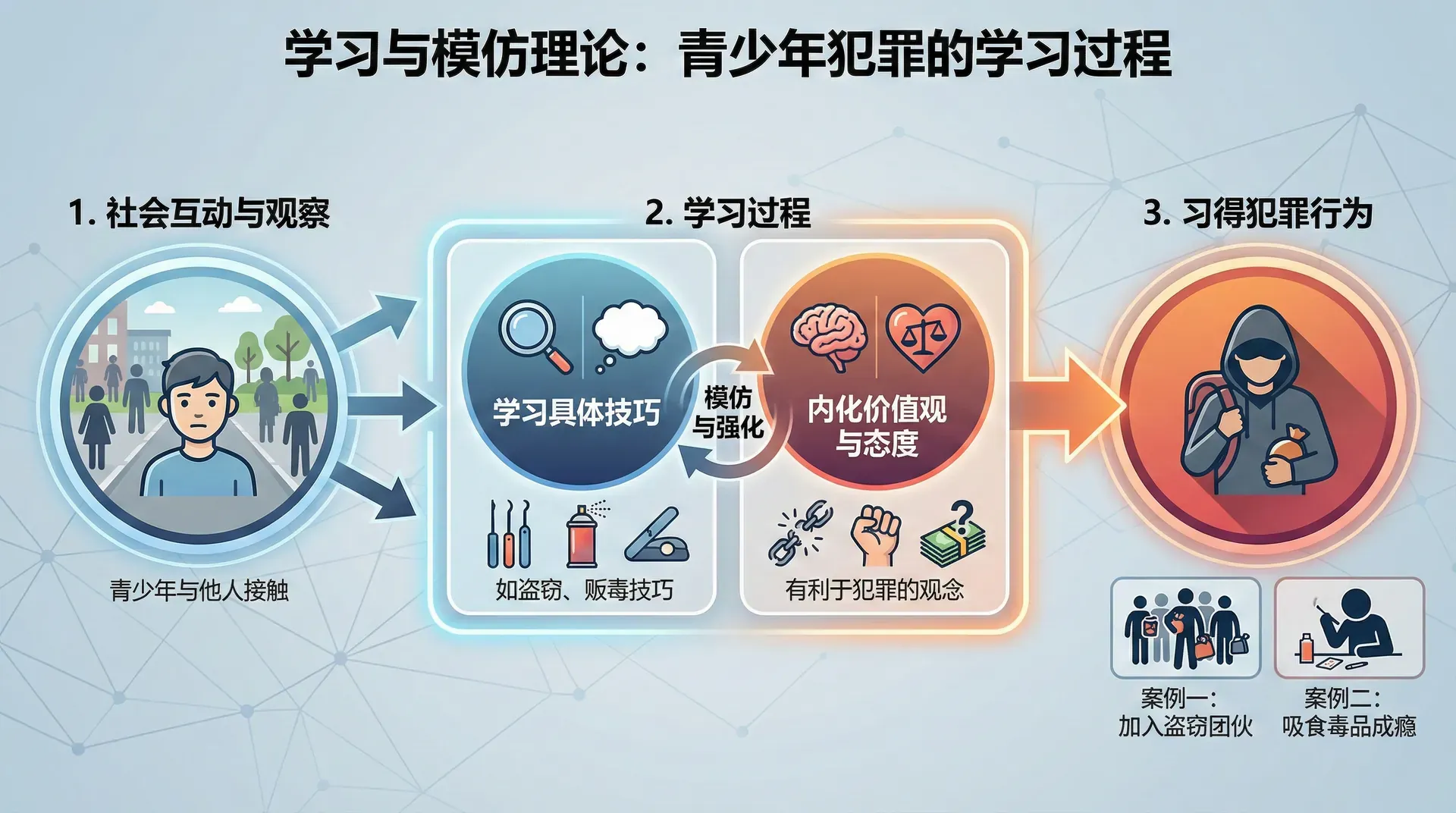 一个十三岁的男孩,原本只是个普通的学生,如何在短短几个月内学会了偷盗技巧,并加入了一个盗窃团伙?一个女孩,原本对毒品毫无认识,为什么会开始吸食并最终上瘾?学习理论认为,这背后是一个复杂的社会学习过程。青少年在与他人的互动中,不仅学到了犯罪的具体技巧,更重要的是,他们内化了有利于犯罪的价值观和态度。