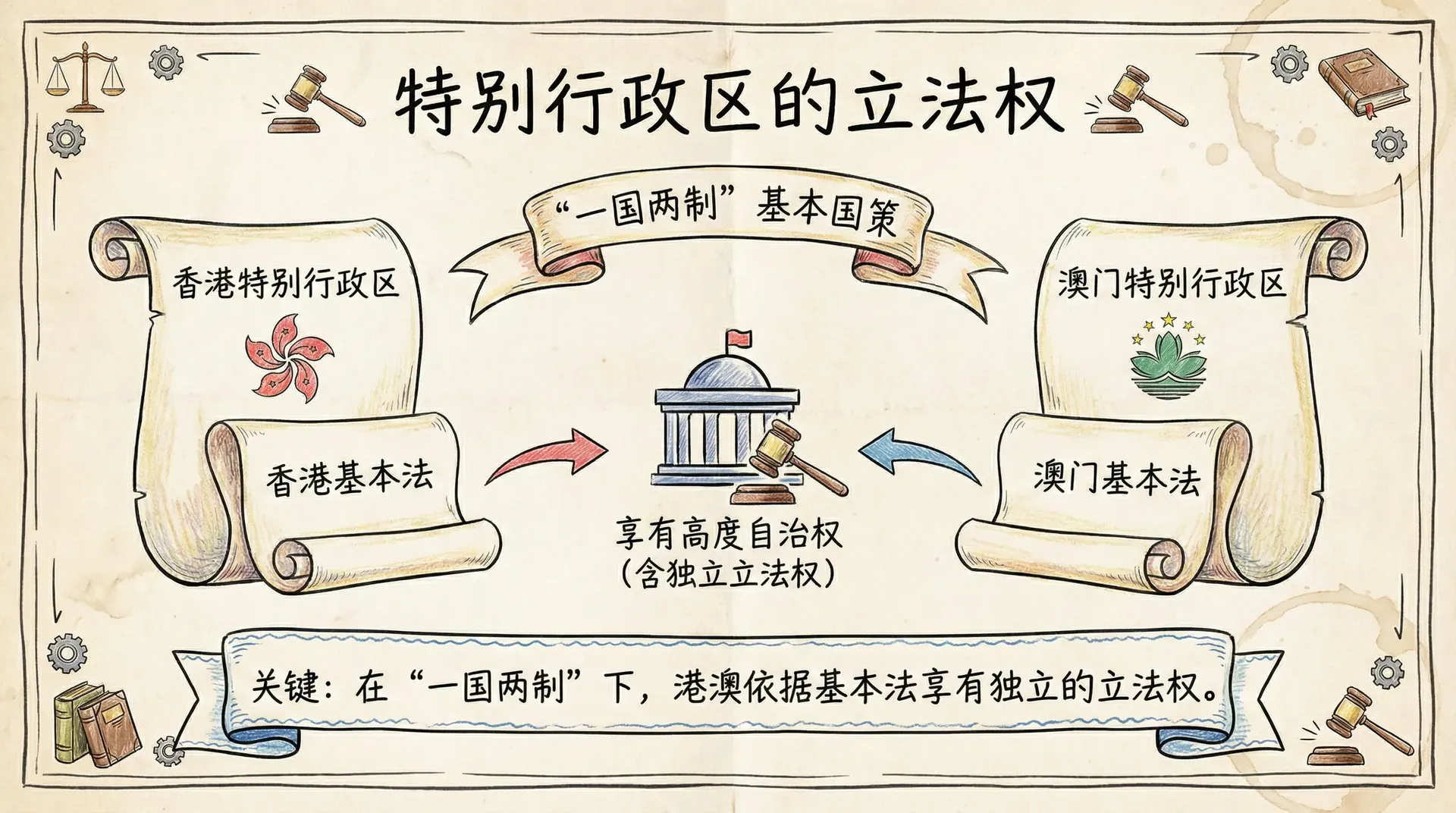 “一国两制”是中国的基本国策,香港特别行政区和澳门特别行政区依据各自的基本法享有高度自治权,包括独立的立法权。