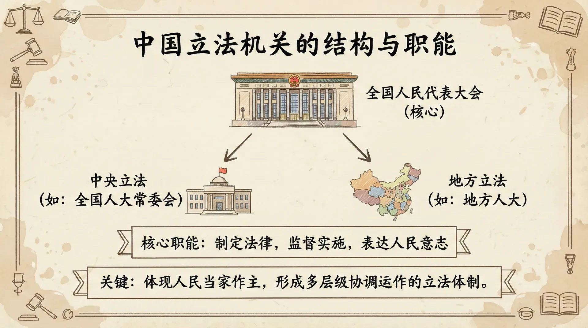 在中国,立法权的配置体现了人民当家作主的根本政治制度,形成了以全国人民代表大会为核心、多层级协调运作的立法体制。