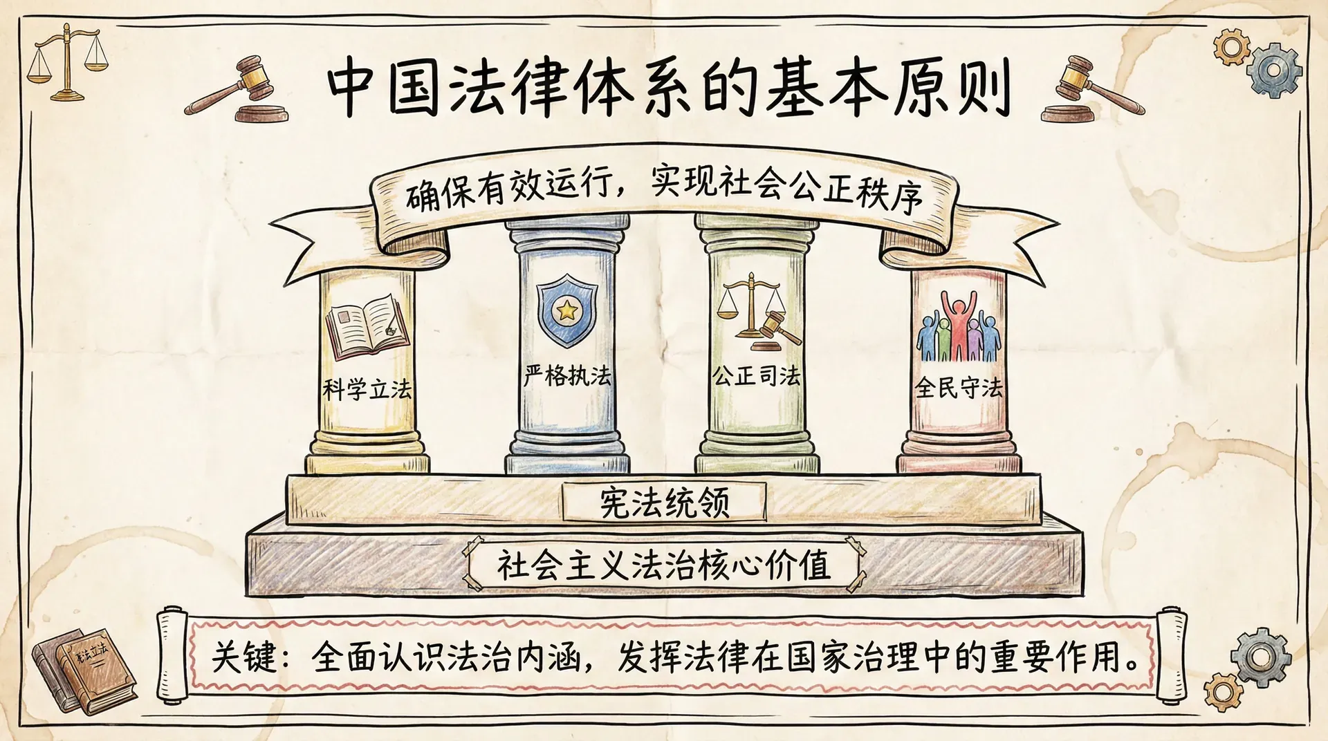 中国法律体系是在宪法的统领下,由各类法律规范构成的有机整体。为了确保法律体系的有效运行和社会公正秩序的实现,我国法律体系确立了一系列基本原则。这些原则既反映了社会主义法治国家的核心价值和政治体制的本质要求,也是立法、执法、司法和守法活动必须遵循的基石。
