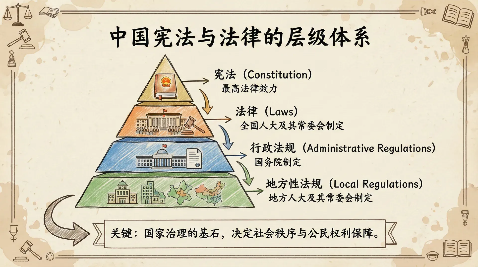 法律是国家治理的基石,一个国家的法律体系如何构建,直接决定了社会秩序的稳定程度和公民权利的保障水平。中国在建设现代法治国家的道路上走出了独具特色的路径,理解中国法律体系的层级结构,是认识当代中国国家治理逻辑的关键。
