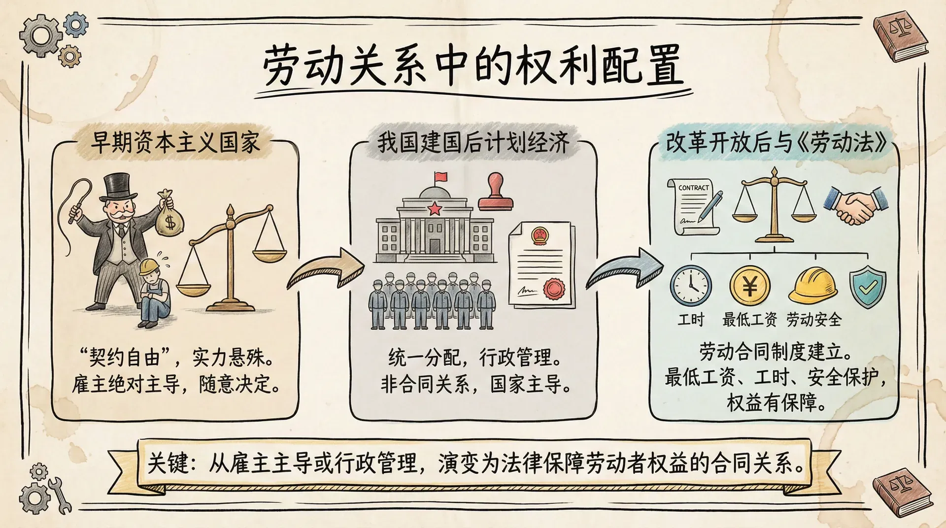 我国建国后很长时期内,城镇就业实行统一分配制度,劳动者与用人单位之间是行政管理关系而非合同关系。改革开放后,劳动合同制度逐步建立。1995年《劳动法》实施,确立了劳动合同制度、最低工资制度、工时制度、劳动安全卫生制度等一系列保护劳动者权益的制度。