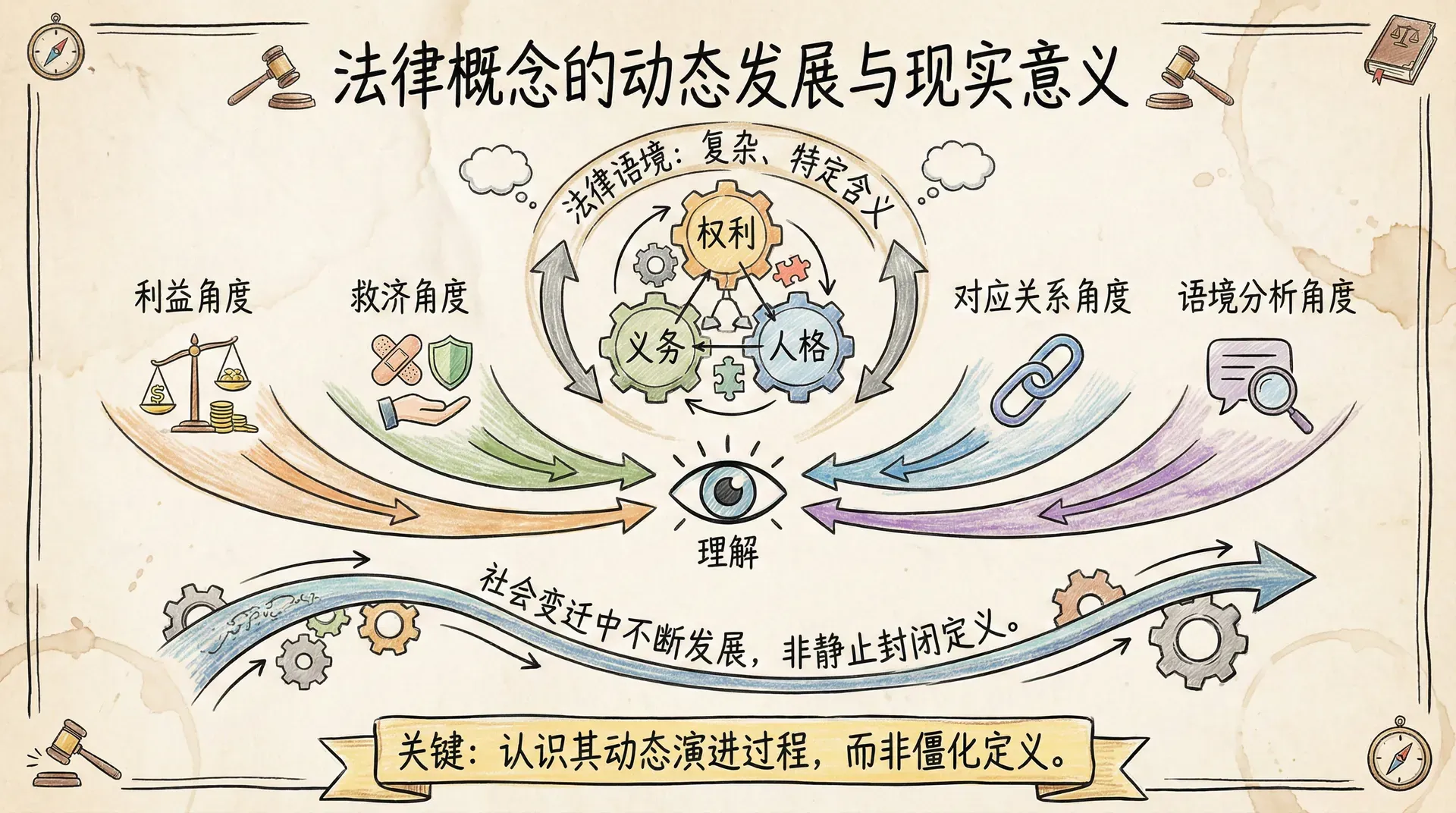理解法律概念,不能脱离其产生和运作的社会、经济、政治背景。权利、义务、人格等概念,是法律关系的符号表达,这些关系本身处于不断的变化和调整之中。