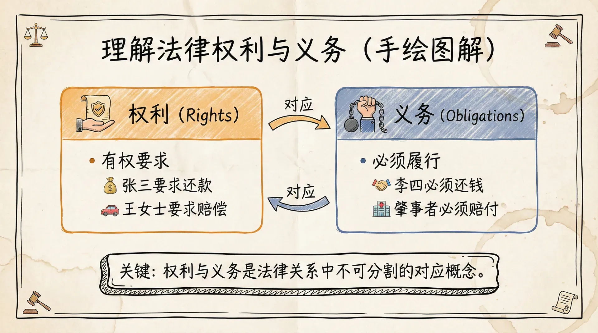 现在让我们把视角从宏观的人权保障转向更具体的问题:当我们说“张三有权要求李四偿还欠款”,或者“王女士有权就车祸事故获得赔偿”时,这些话究竟意味着什么?法学家们对“权利”和“义务”这两个概念提出过许多不同的分析,虽然没有哪种分析能让所有人满意,但这些理论探索为我们理解法律概念提供了有益的视角。