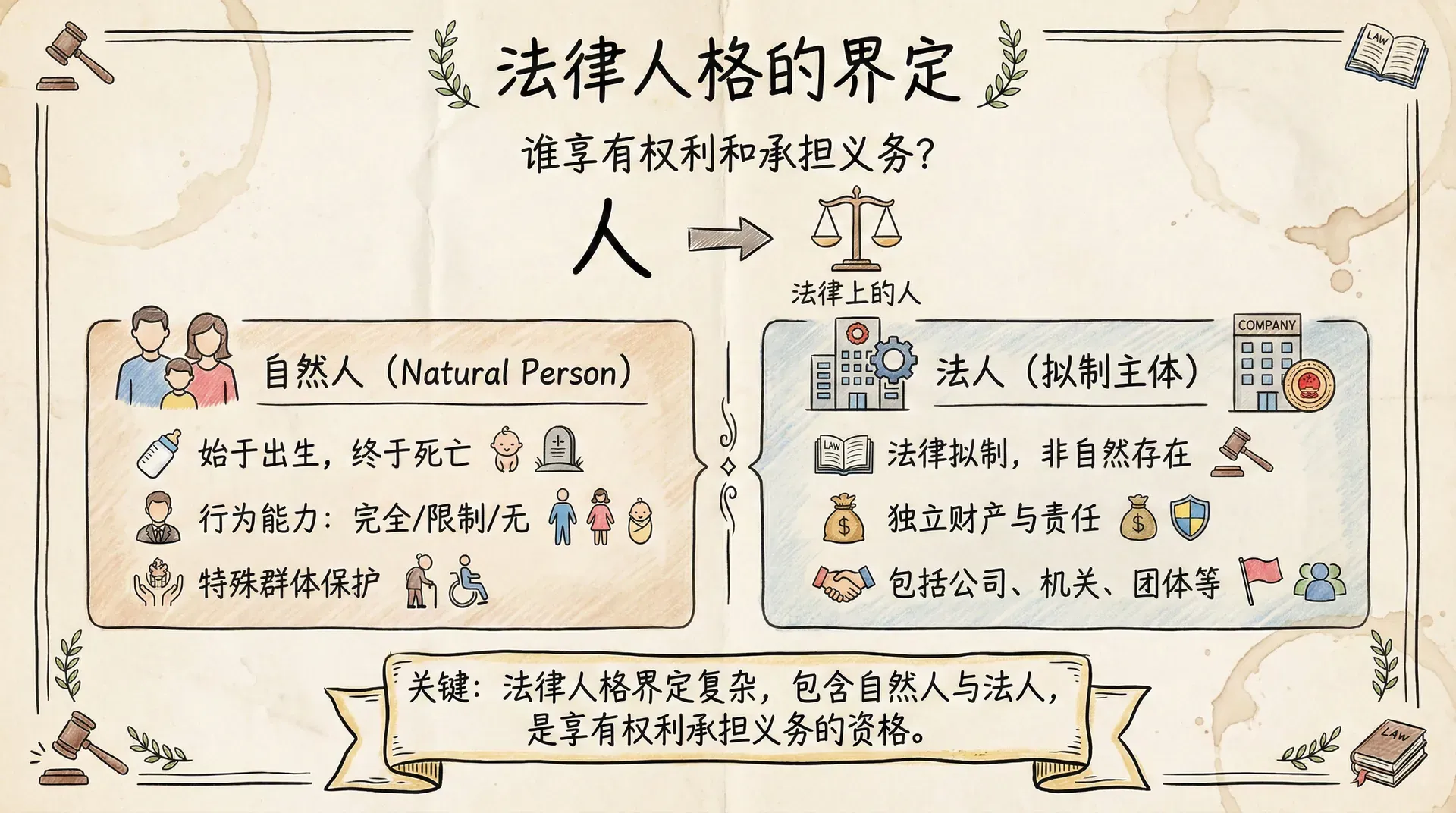 谈到权利和义务,我们自然会问:谁能够享有权利和承担义务?答案看似简单——当然是“人”。但在法律上,“人”这个概念远比我们日常理解的要复杂得多。法律中的“人”,也就是法律人格,不仅包括自然人,还包括法人等拟制主体。而即使是自然人,其法律人格的界定也涉及许多复杂的问题。