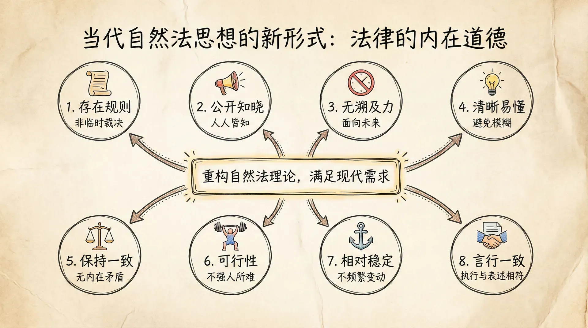 “法律的内在道德”这一概念认为,要创建和维持一个真正的法律体系,必须满足某些程序性要求。这些要求包括:第一,应当存在规则,而不是一系列临时性的个案裁决;第二,这些规则必须让所有受其影响的人知晓;第三,规则不应具有溯及力;第四,规则应当清晰易懂;第五,规则应当保持一致;第六,规则不应要求人们做不可能之事;第七,规则不应频繁变动,以至于人们无法据此指导自己的行为;第八,规则的正式表述应当与实际执行相一致。