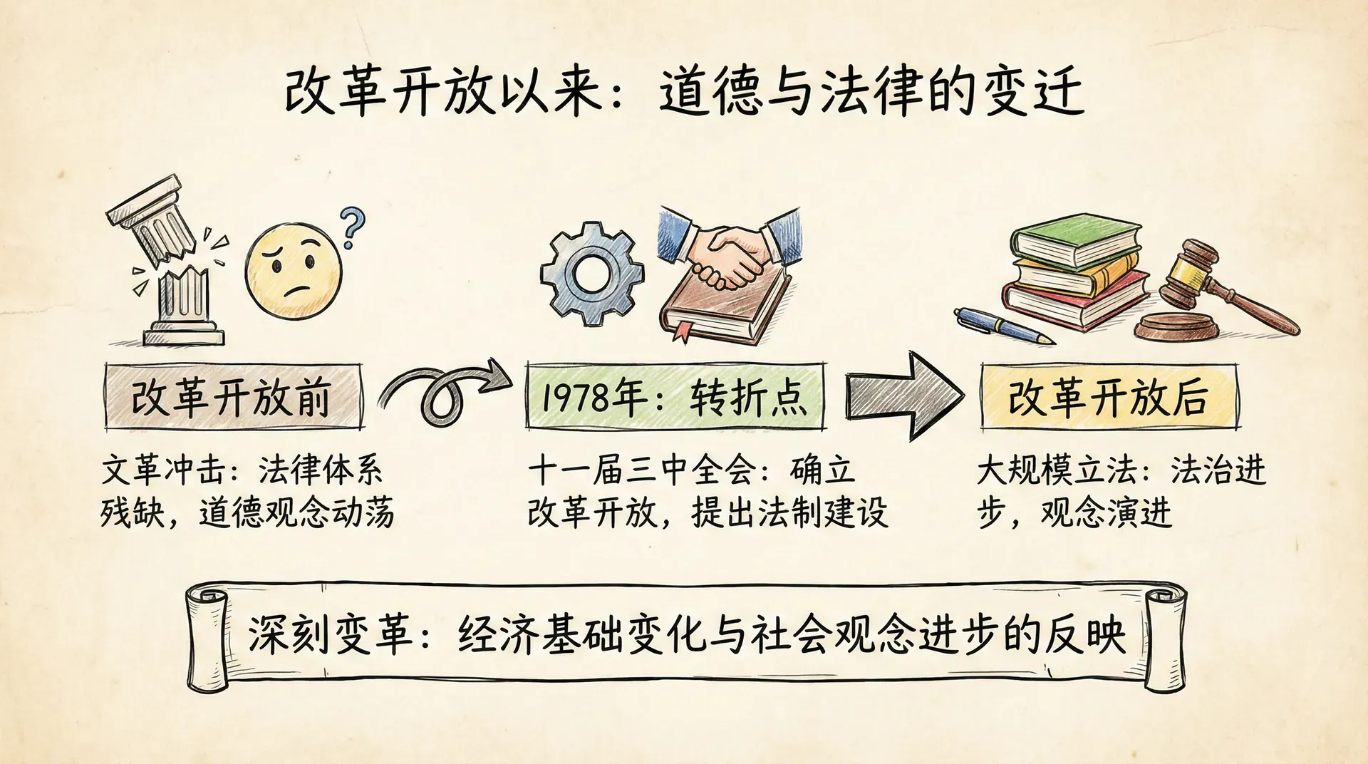 要理解当代中国法律与道德的关系,需要回顾改革开放以来中国社会经历的深刻变革。这一时期的道德法律变迁,不仅反映了经济基础的变化,也体现了社会观念的演进和法治建设的进步。