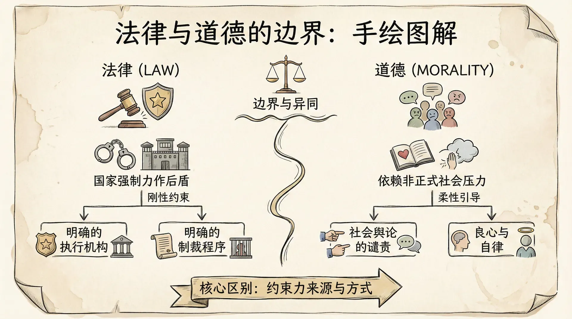 小区里某位邻居被发现有婚外情行为,可能会引发其他邻居的指指点点和疏远,但这种行为本身并不违法。相反,如果此人酒后驾车,即便未发生事故,也会受到法律的严厉处罚——吊销驾照、罚款甚至拘留。前者受到的是道德谴责,后者面对的是法律制裁。