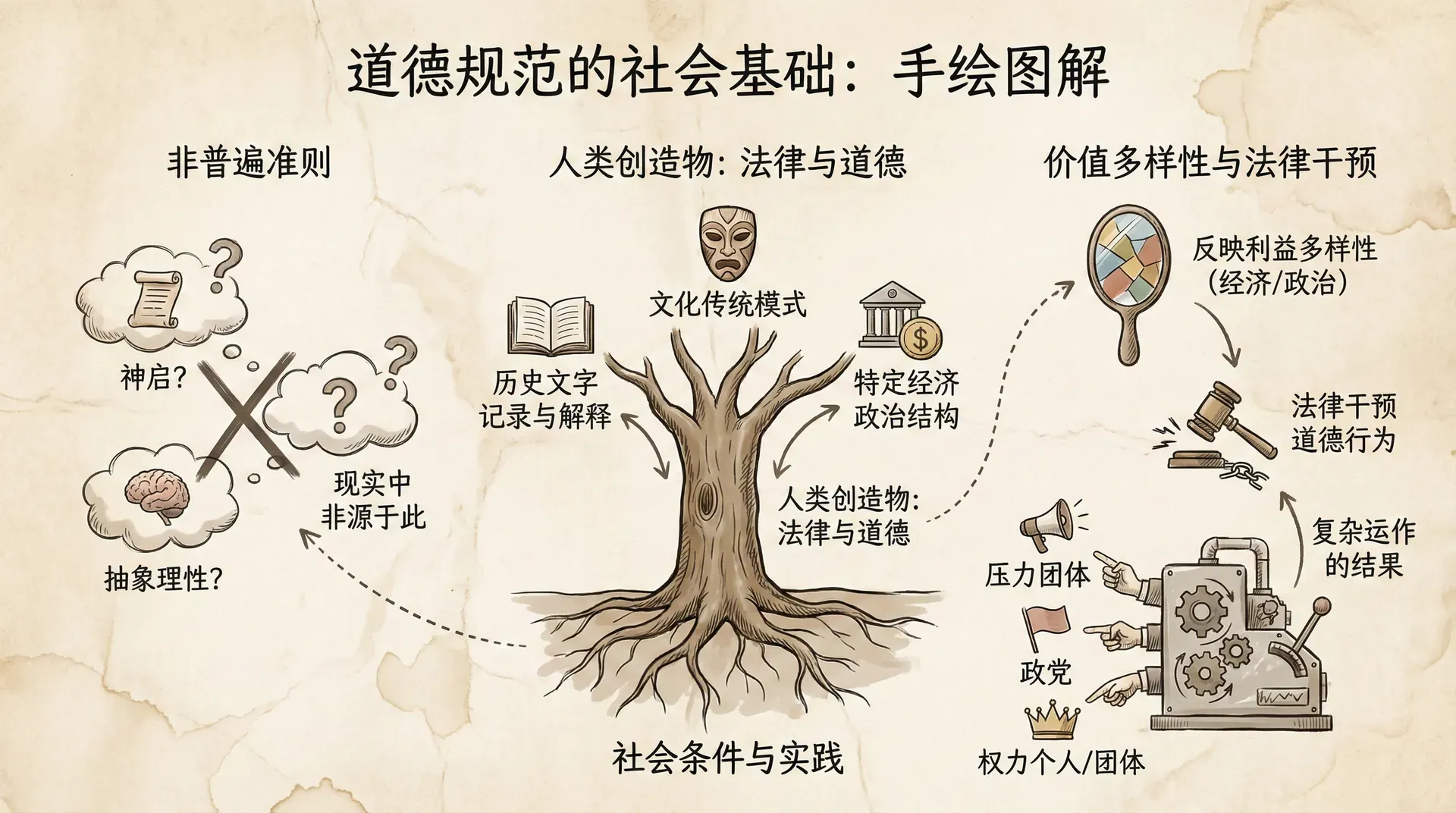 上述情况表明,尽管某些宗教或哲学体系试图建立某种普遍的道德准则,但现实中的道德规范和法律规则,与其说是源于神启或抽象的理性推理,不如说是深深植根于社会条件和实践之中。法律和道德都是人类的创造物,其基础是历史上特定时期的文字记录和解释、文化传统模式以及由特定的经济政治结构所决定的社会生活条件。