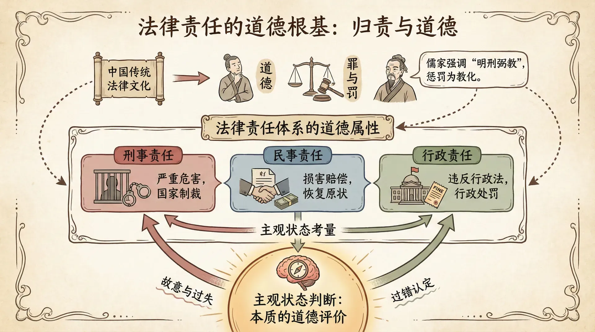 当代中国的法律责任体系分为刑事责任、民事责任和行政责任三种类型。每一种责任的认定都离不开对行为人主观状态的考量,而这种主观状态的判断本质上是一种道德评价。