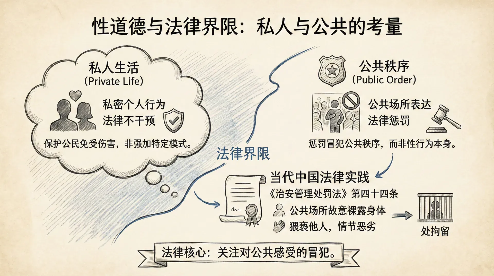 这一观点在当代中国的法律实践中有所体现。法律主要关注的是性行为的公共表达,而非完全私密的个人行为。