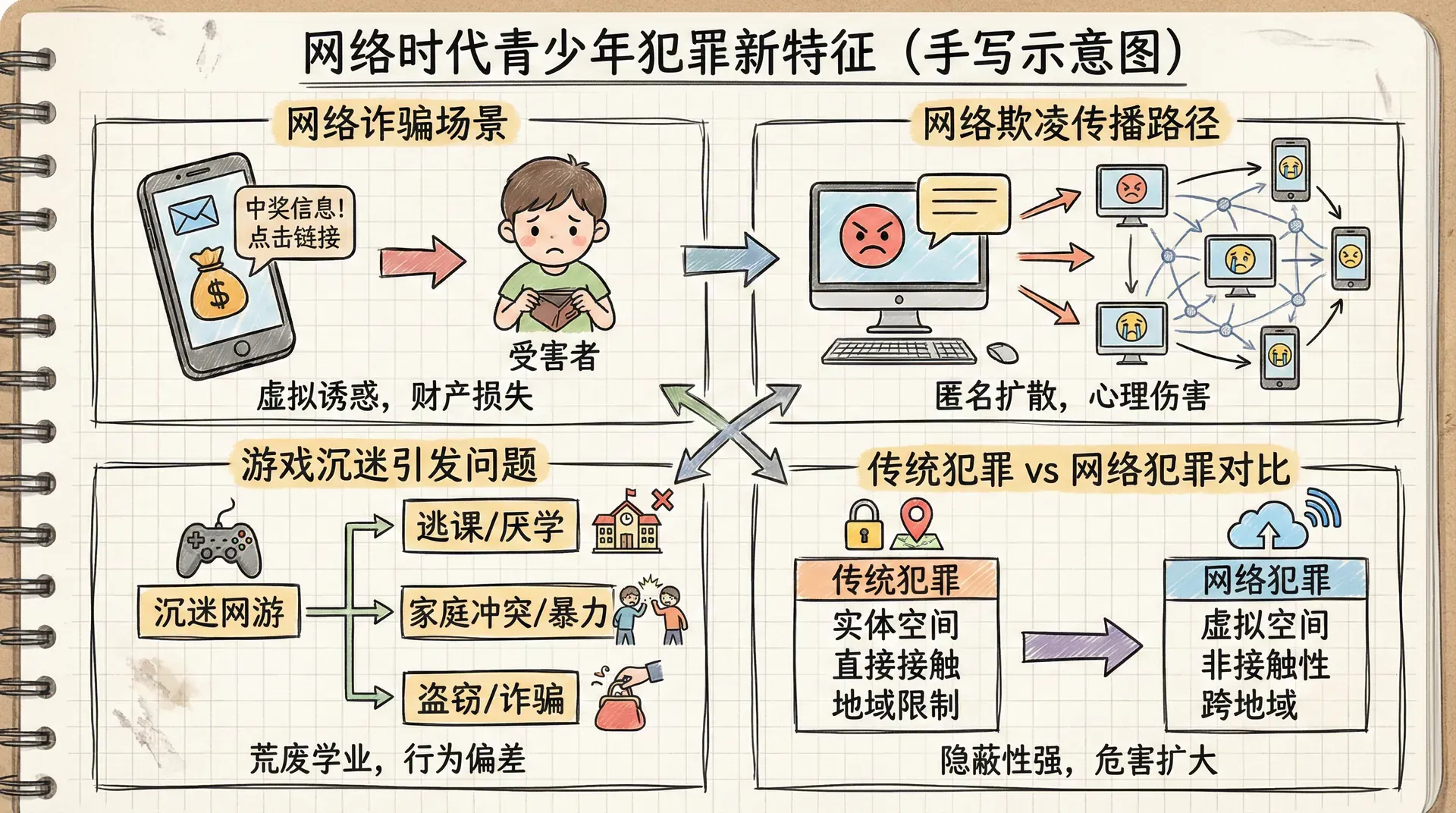 网络时代的青少年犯罪呈现全新特征。犯罪空间从现实转向虚拟,作案手段从传统变为科技化,犯罪对象从特定人群扩展到不特定多数人。一个坐在电脑前的青少年,可能同时对成百上千人实施诈骗。一段恶意传播的视频,可能对被害人造成持久的心理伤害。网络的匿名性、即时性、广泛性,既放大了犯罪的危害,也增加了预防和打击的难度。