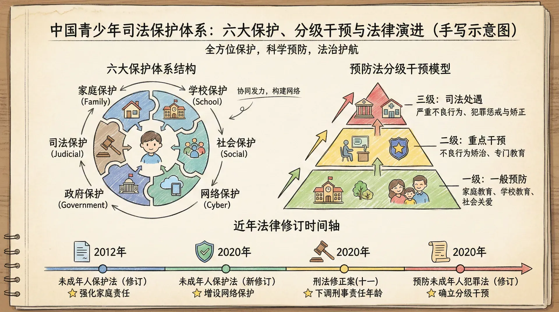 《未成年人保护法》确立的家庭保护、学校保护、社会保护、网络保护、政府保护、司法保护六大保护体系,是国家应对青少年犯罪的综合框架。这六大保护相互联系、相互补充,共同为青少年健康成长保驾护航。