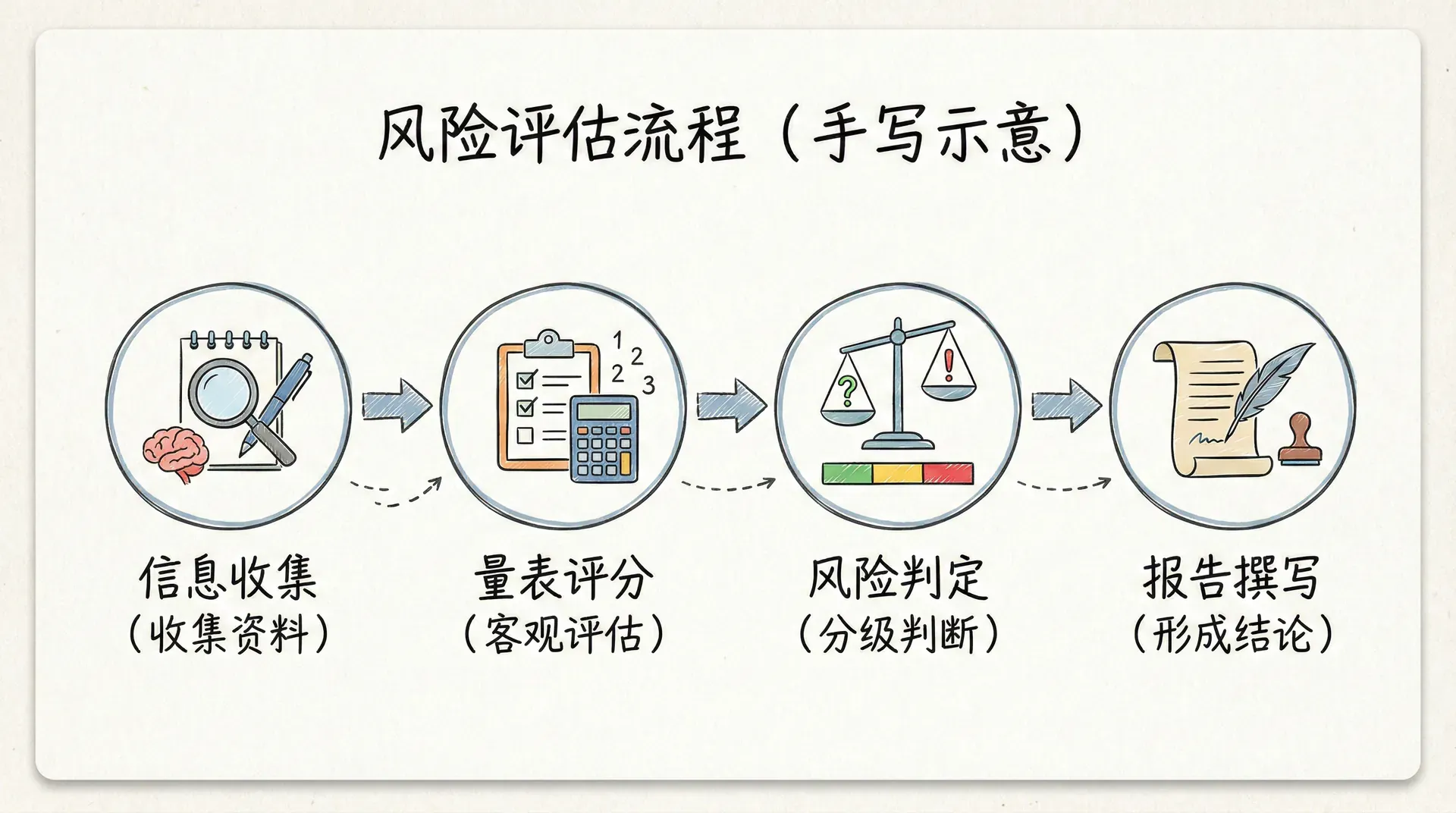 评估过程要规范。首先收集信息,查阅案卷材料、社会调查报告,访谈未成年人本人、法定代理人、老师、社工。然后根据评估工具逐项评分,客观判断每个因素是否存在、程度如何。接着计算总分,确定风险等级。最后撰写评估报告,说明评估依据、评分理由、风险判断、干预建议。