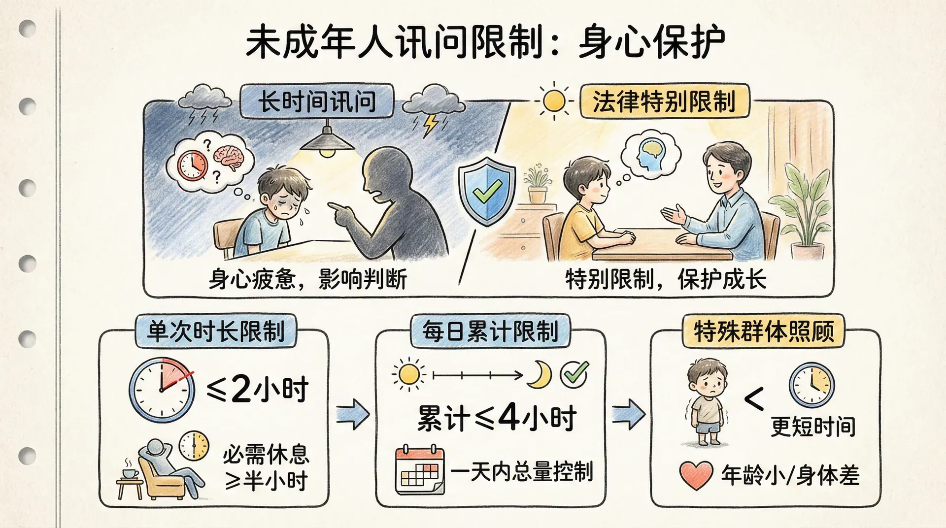 未成年人身心发育不成熟,承受能力较弱,长时间讯问容易造成身心疲惫,影响正常判断。因此,法律对讯问未成年人的时间、方式、环境都有特别限制。