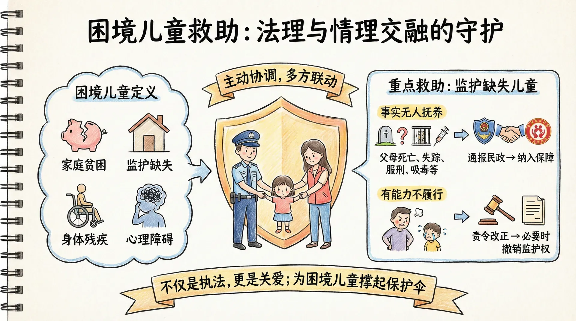 困境儿童是指因家庭贫困、监护缺失、身体残疾、心理障碍等原因,生活陷入困境的未成年人。公安机关在执法办案中,经常会遇到困境儿童,不能简单地就案办案,而要主动协调相关部门开展救助。
