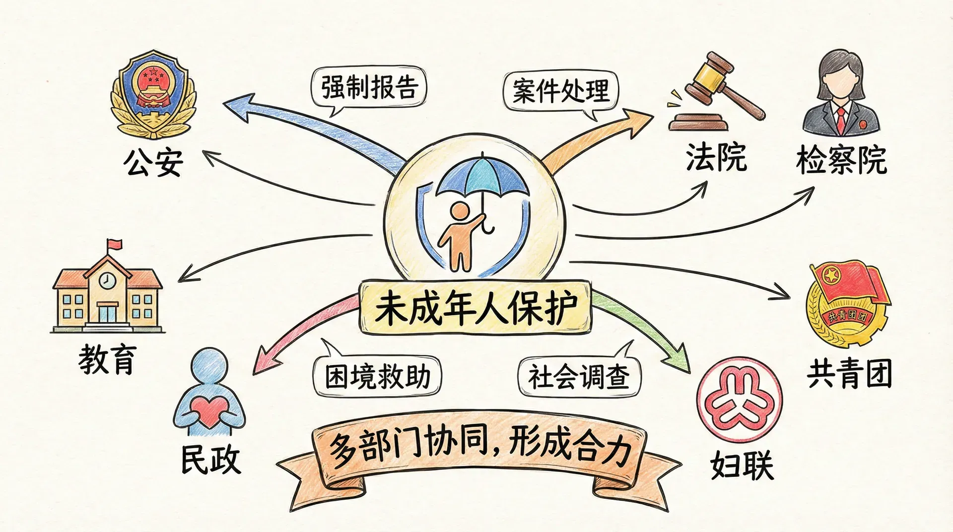 多部门协作体现了保护的系统性和整体性。未成年人保护不是某一个部门单打独斗,而是需要多个部门协同发力。强制报告制度让全社会共同参与保护,快速处置机制保证了及时干预,困境儿童救助则展现了对弱势群体的关爱和支持。