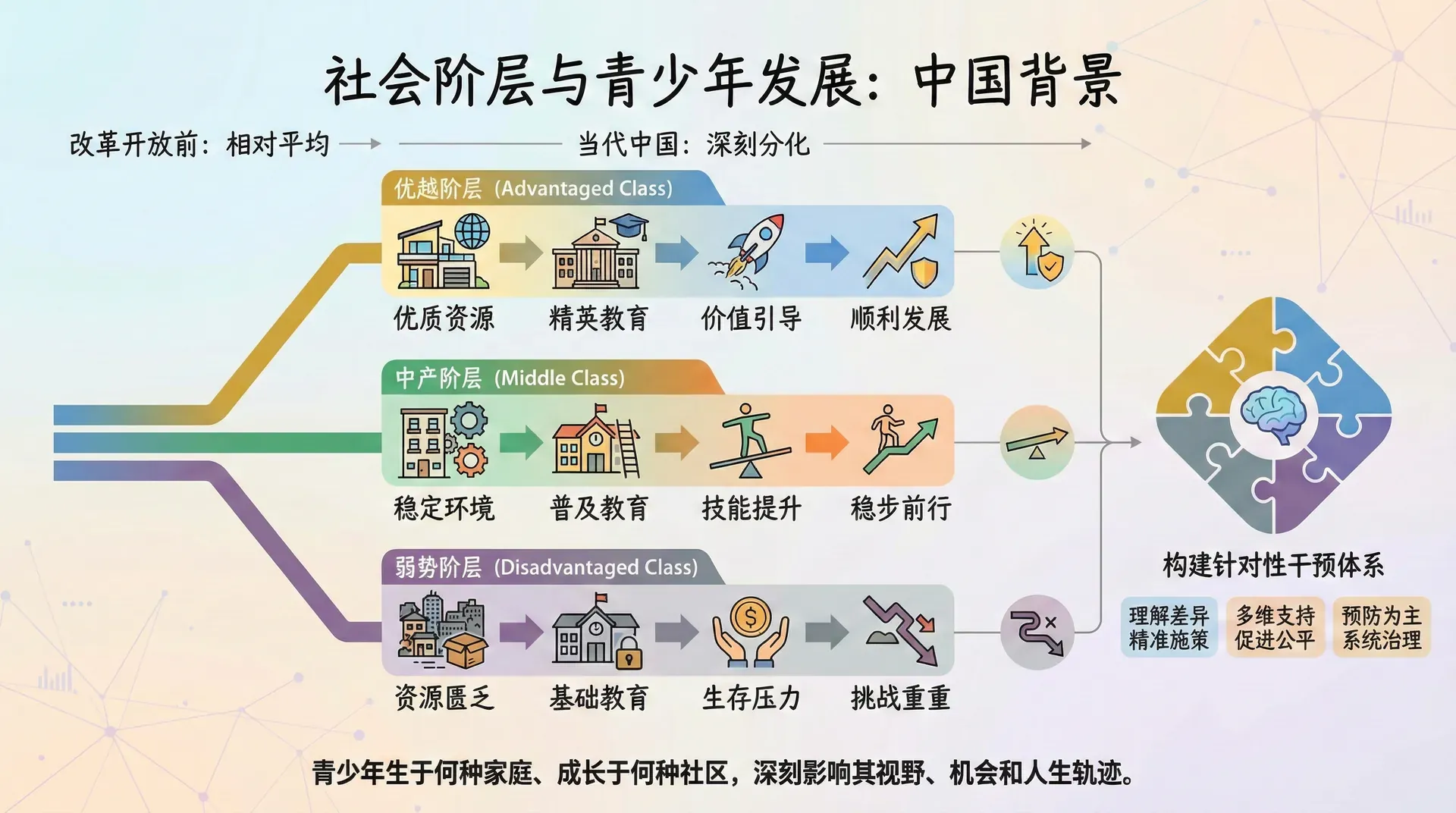 当代中国社会正经历深刻的分层与分化。改革开放打破了计划经济时代相对平均的社会结构,不同职业、不同收入、不同教育背景的群体在生活方式、价值观念、发展机会等方面出现明显差异。社会阶层的分化不仅是经济现象,更是影响青少年成长的重要社会背景。