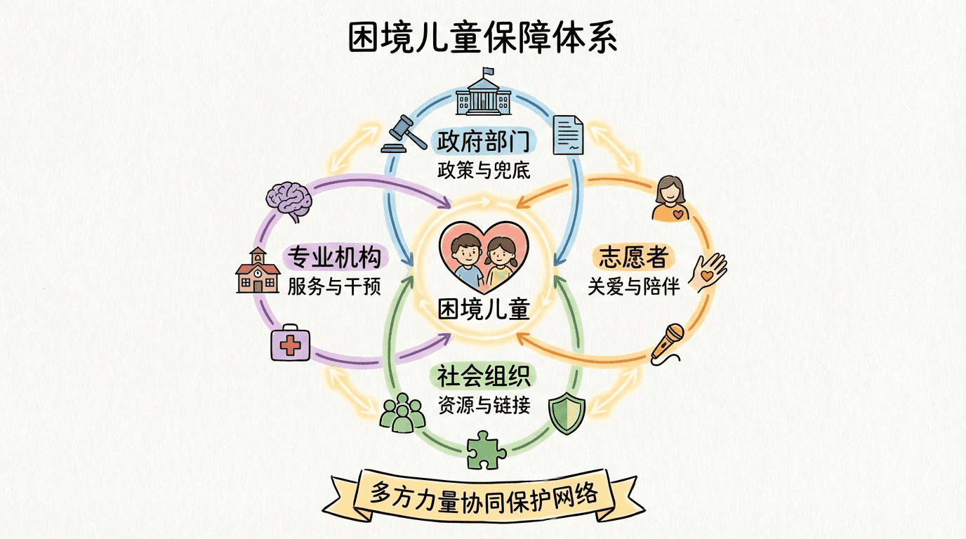 中国政府高度重视困境儿童保护。2016年国务院出台《关于加强困境儿童保障工作的意见》,将孤儿、自身困境儿童、家庭困境儿童、安全困境儿童等纳入保障范围。各级民政部门建立了困境儿童分类保障制度,根据不同困境类型提供相应救助。
