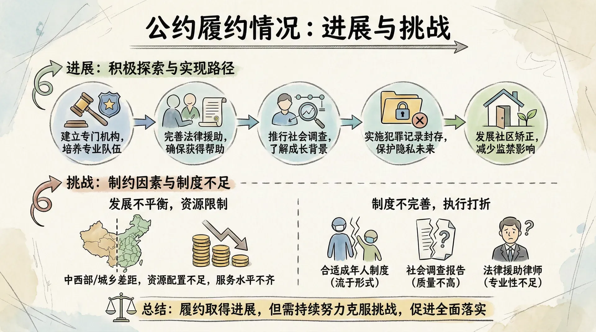 但履约也面临挑战。受经济社会发展水平限制,中西部欠发达地区在资源配置、专业队伍、服务水平等方面存在差距。城乡之间、地区之间发展不平衡,导致保护水平参差不齐。一些具体制度还不够完善,合适成年人制度在某些地方流于形式,社会调查报告质量不高,法律援助律师专业性不足。