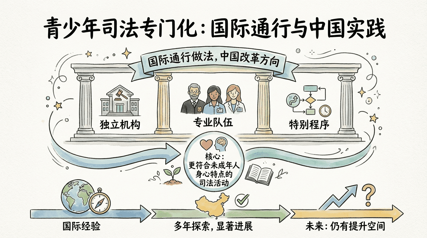 青少年司法的专门化是国际通行做法,也是中国司法改革的重要方向。专门化意味着独立的机构、专业的队伍、特别的程序,意味着更符合未成年人身心特点的司法活动。经过多年探索,中国在专门化建设方面取得显著进展,但仍有提升空间。