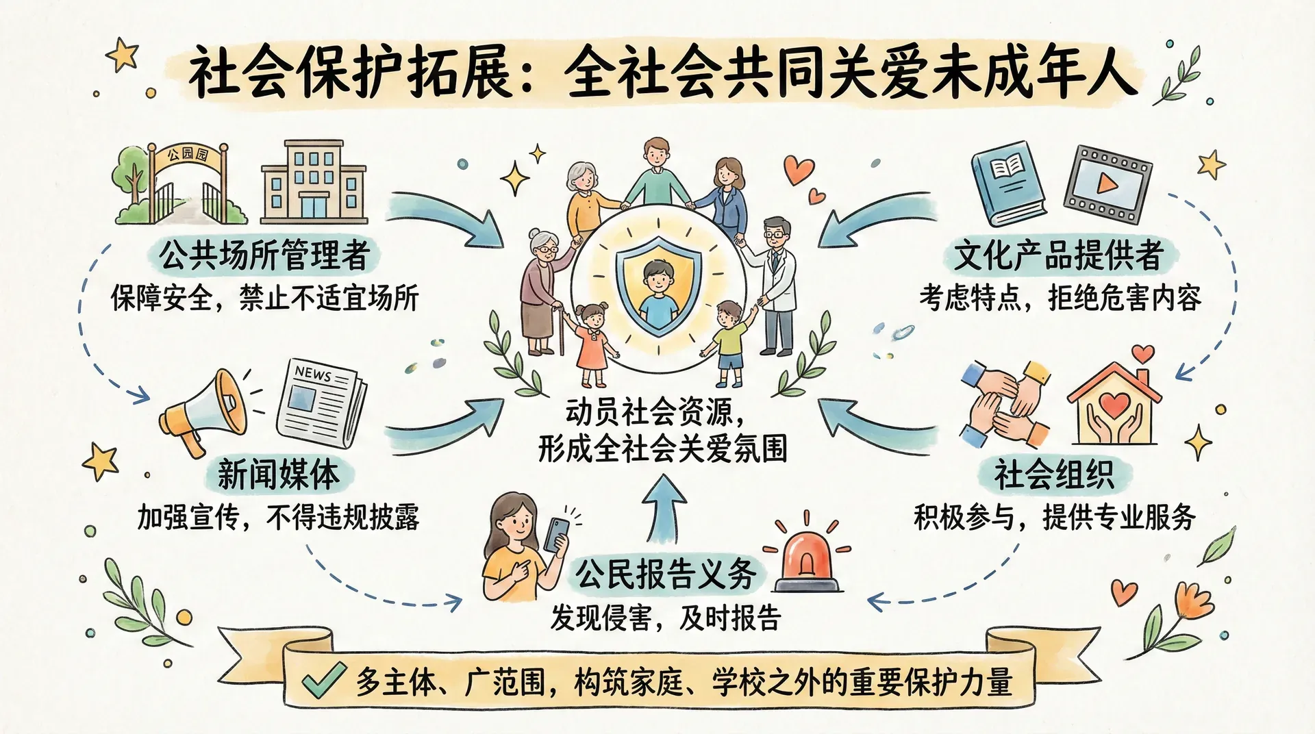 社会保护包括多个层面。公共场所管理者要保障未成年人的安全,禁止未成年人进入不适宜的场所;文化产品和服务提供者要考虑未成年人特点,不得提供危害未成年人身心健康的内容;新闻媒体要加强未成年人保护宣传,不得违规披露未成年人案件信息;社会组织要积极参与未成年人保护工作,提供专业服务;公民要履行报告义务,发现侵害未成年人权益的情况要及时报告。