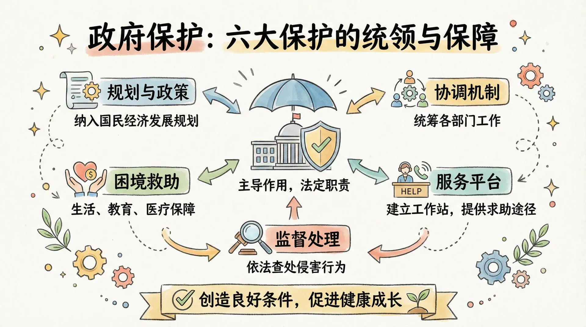 政府保护体现在多个层面。制定和实施未成年人保护规划和政策,将未成年人保护纳入国民经济和社会发展规划;建立未成年人保护工作协调机制,统筹协调各部门工作;为困境未成年人提供生活保障、教育资助、医疗救助等;建立未成年人保护工作站和服务平台,为未成年人提供便利的求助途径;对侵害未成年人权益的行为进行监督检查和依法处理。