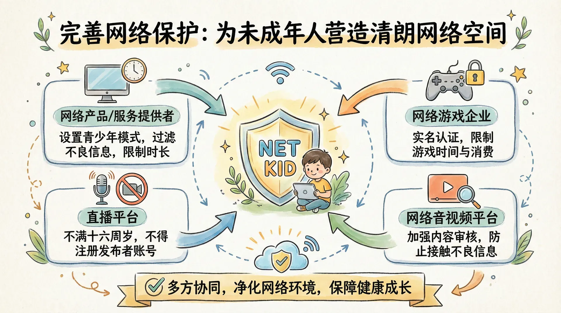 完善网络保护需要综合施策。完善法律制度,细化平台责任,加大违规成本;推动技术创新,开发更有效的保护工具和识别技术;加强宣传教育,提高未成年人和家长的网络素养;强化执法监管,对违法违规行为严肃查处;推动行业自律,建立网络企业保护未成年人的共同标准。