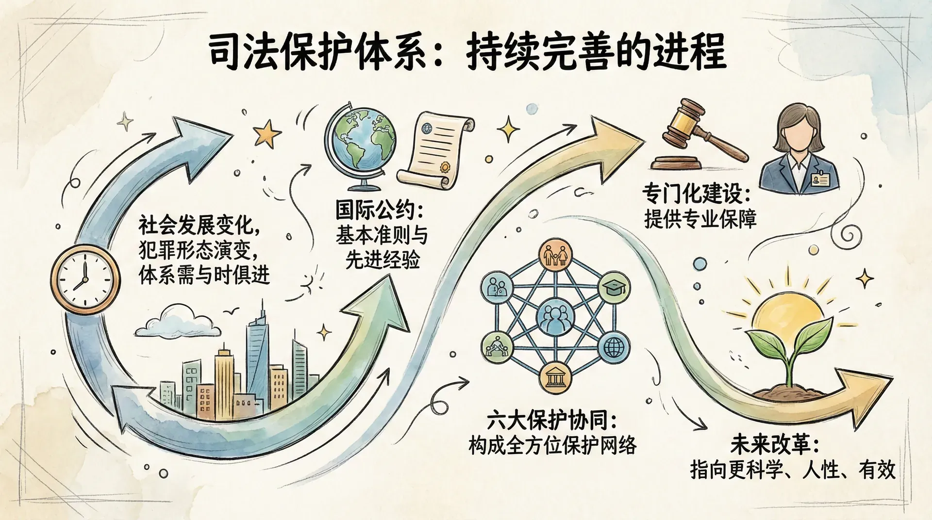 体系完善是持续的过程。随着社会发展变化,青少年犯罪的形态、成因、特点不断演变,司法保护体系也必须与时俱进。国际公约提供基本准则和先进经验,专门化建设提供专业保障,六大保护协同构成全方位保护网络,未来改革则指向更科学、更人性、更有效的方向。